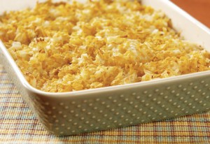 - Pour into a greased casserole and top with 1 cup of potato chips and 2 tsp of melted butter.