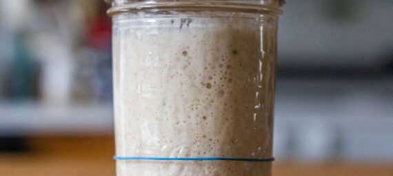 Keep starter in fridge. Feed starter every 2-3 days. Mark jar with elastic at starter level after feeding.
